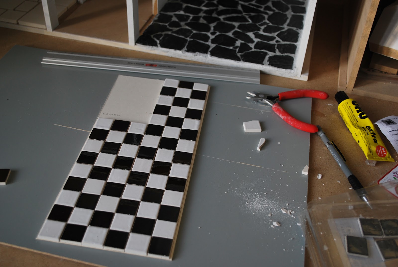 Me revoilà, alors que le hall est loin d'être fini, juste parce que pour moi, c'est une fameuse étape. Première pose d'éclairage de toute ma courte carrière de miniaturiste ;-)
